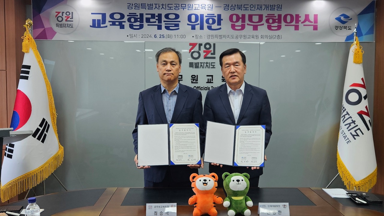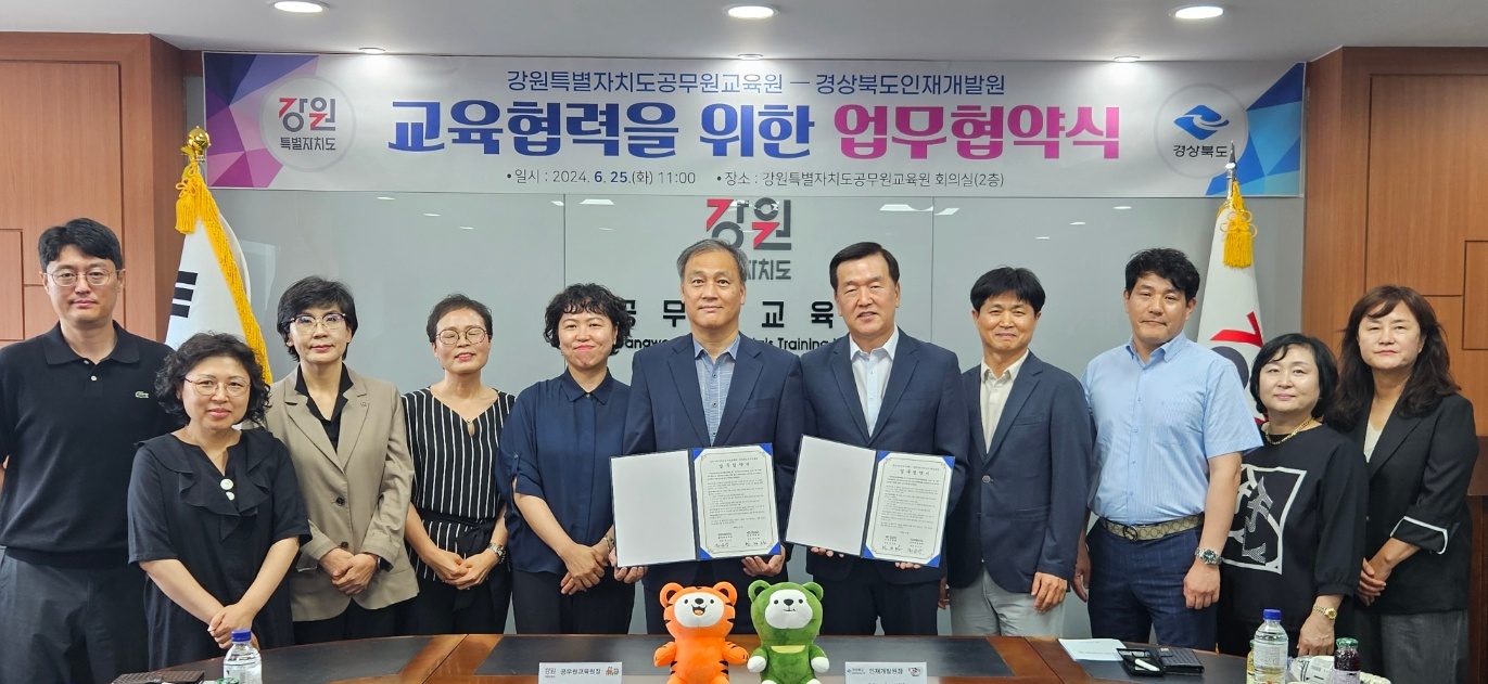 □ 강원특별자치도 공무원교육원(원장 최승극)은 경상북도 인재개발원(원장 한승환)과 6월 25일 강원특별자치도공무원교육원에서 업무협약을 체결했습니다. ○ 본 협약은 공무원 교육기관간 상호 협력을 통해 공무원 교육훈련의 질적 향상과 지역사회 발전을 도모하기 위해 상호 협력체계 구축을 목적으로 하고 있습니다. ○ 양 기관은 ▴기관별 지역특화 교육과정 운영 및 교육생 교류 ▴우수 교육프로그램 및 우수 강사정보 공유 등 교육의 질 향상 ▴양 기관의 교육목적 달성을 위한 상호교류‧연수 프로그램 지원 등을 목표로 상호 협력할 계획입니다. □ 이번 협약으로 양 기관은 하반기부터 각 기관별 지역특화 교육과정을 협력 운영하고, 지역소멸대응, 동해안권‧중부내륙권 경제 활성화 등 공동의 문제를 해결하기 위한 장기적인 공동 교육프로그램을 개발‧운영하는 데 중점을 둘 예정입니다. ○ 특히, 하반기 강원의 산림문화 교육과정(“레츠고! 산에가자!”)과 경북의 지역문화 이해과정(“경북형 전통문화체험”)에 교육생을 교류하여 두 지역의 특성 이해와 관점을 넓히는 교육을 운영할 계획입니다. □ 또한, 내년부터는 장기 교육과정 교류도 추가로 진행하고,‘26년도 경북교육원 안동 이전, 충북교육원 제천 이전이 완료되면 3개도 교육기관 간 교육협력이 한층 더 강화될 전망입니다. □ 최승극 강원특별자치도 공무원교육원장은 “금년 상반기에 특별자치도의 조기 정착을 위해 특별자치도인 제주, 전북과 교육생 교류를 통한 상생협력 과정 운영에 이어, 인근지역인 경북인재개발원과도 협력을 확대해 나감으로써 지역간 교류를 통한 교육생들의 이해의 폭을 넓히고 지역인재 육성효과를 극대화할 계획”이라고 밝혔습니다. *관련 기사 1. 강원일보 : https://www.kwnews.co.kr/page/view/2024062517220884898 2. 강원도민일보 : http://www.kado.net/news/articleView.html?idxno=1251445 |