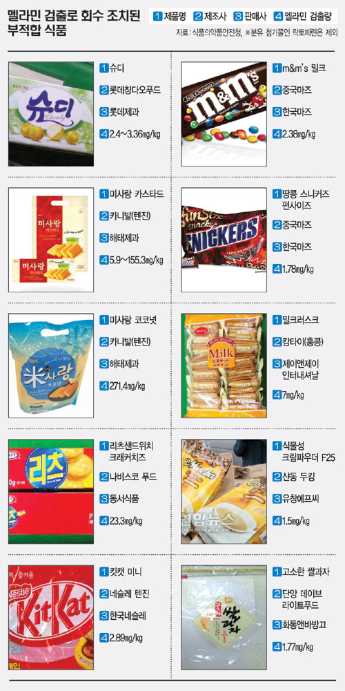 | 제목 | 멜라민 검출로 회수 조치된 부적합 식품 | |||||