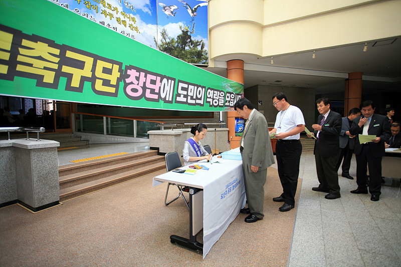 우리 인재기발원에서는 9. 26(금) 원내 중앙홀에서 강원도민프로축구단의 성공적인 창단을 기원하며 도민들의 적극적인 참여유도와 범 도민적인 분위기 조성을 위하여 신규임용후보자 학부모 초청 수료식과 연계하여 교육생 및 교직원 300여명이 참여한 가운데 강원FC 도민주 갖기 행사를 가졌습니다. |