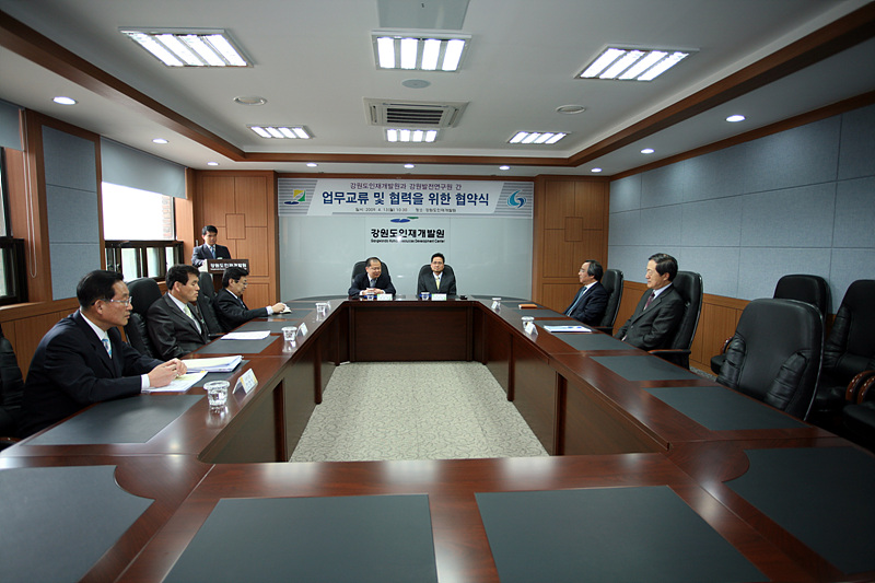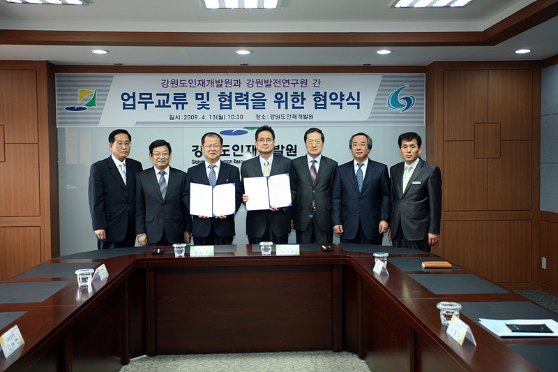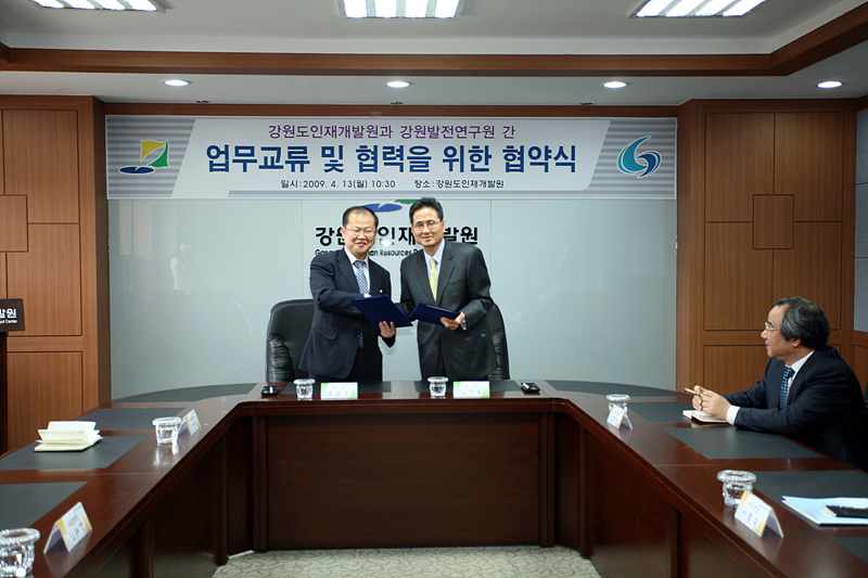 강원도인재개발원과 강원발전연구원 간 업무교류 및 협력을 위한 협약식이 2009. 4. 13(월)에 인재개발원 회의실에서 있었습니다. |