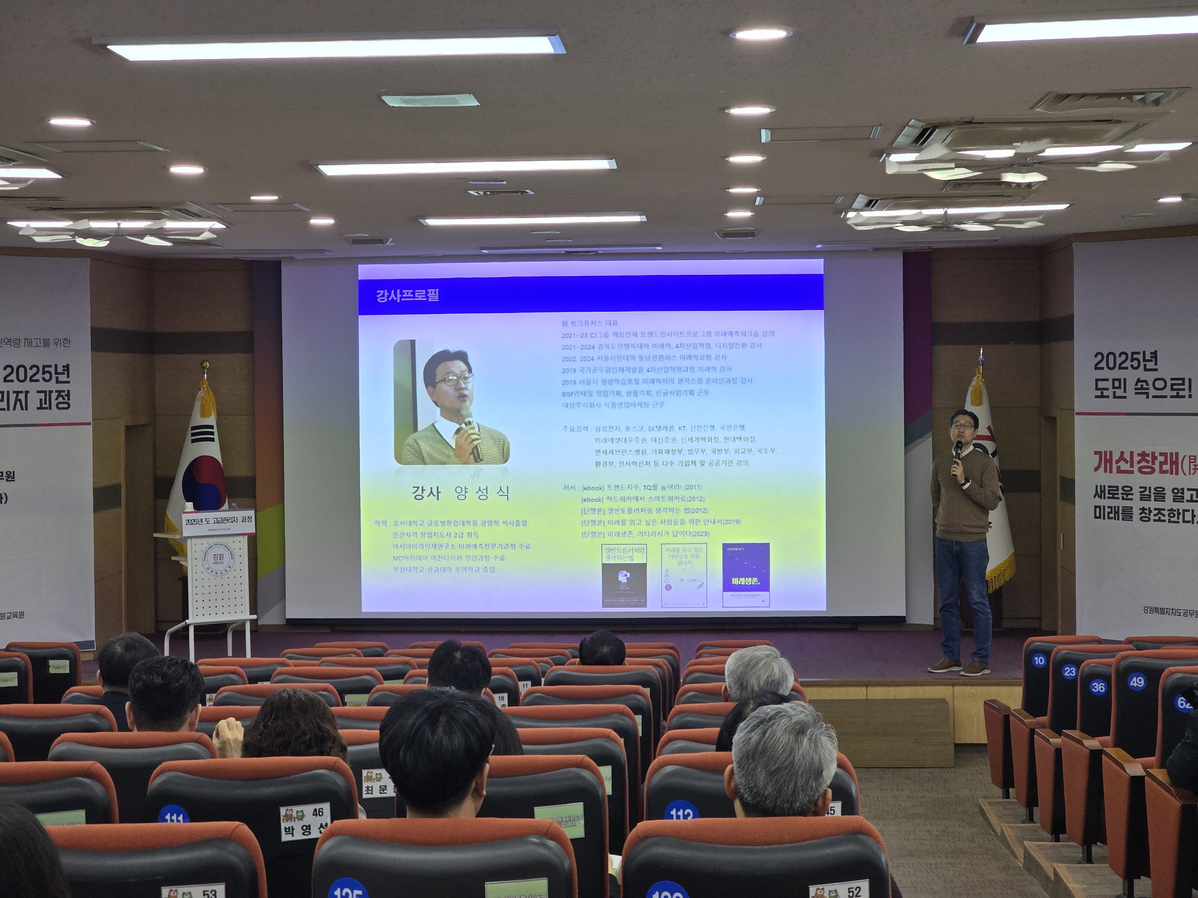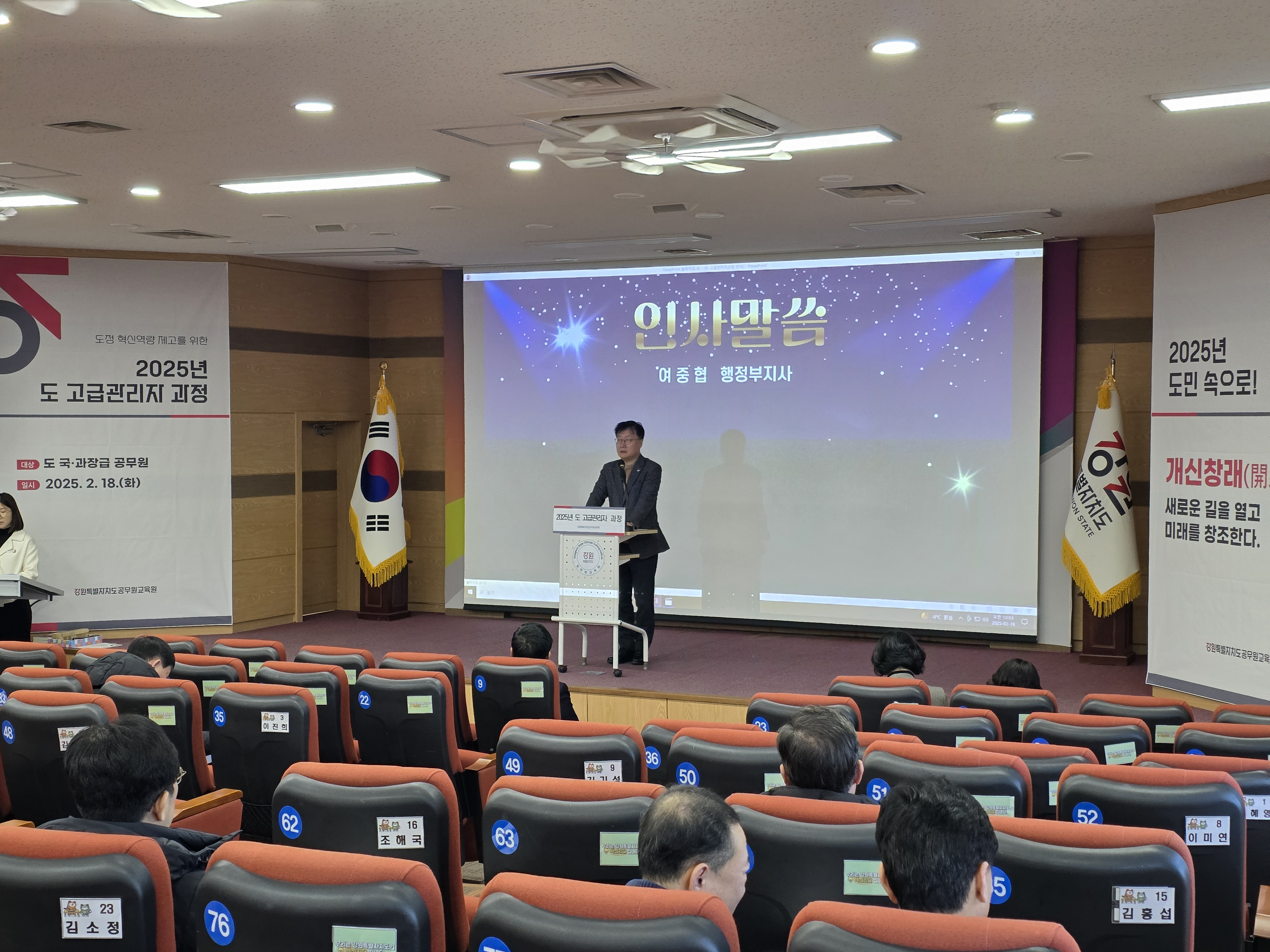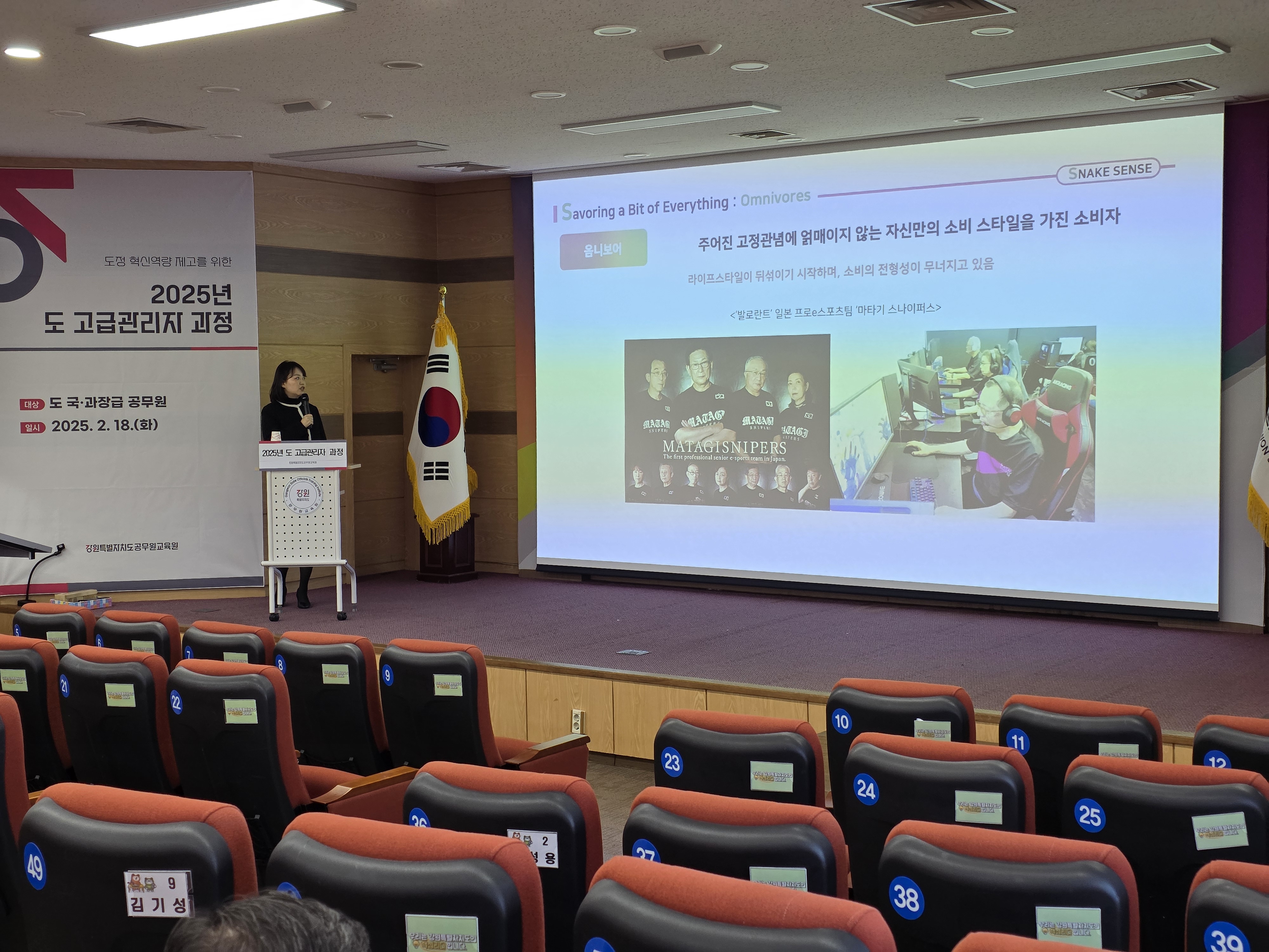 지난 2월 18일(화), 강원특별자치도공무원교육원에서 2025년 도 고급관리자 과정을 운영하였습니다. 이번 과정은 도 국·과장급 공무원을 대상으로 특별자치도의 성공 추진과 성과창출을 위한 관리자 의지 함양과 시대변화 트렌드 인식을 통해 조직변화를 이끌어낼 수 있는 리더십을 배양하기 위해 마련되었습니다. 교육 과정에서는 시대변화 트렌드, 글로벌 경제전망, AI 미래사회 등 도정 혁신 역량 강화를 위한 다양한 프로그램이 진행되었습니다. 이번 과정을 통해 참가자들은 도정 중추리더로서 도정발전 방향의 비전을 공유하는 유익한 시간이 되었습니다. 강원특별자치도공무원교육원은 앞으로도 공직자들의 역량 강화를 위한 체계적이고 실질적인 교육과정을 지속적으로 제공하여, 도민이 신뢰하는 공직사회를 만들어가겠습니다. 감사합니다. |
