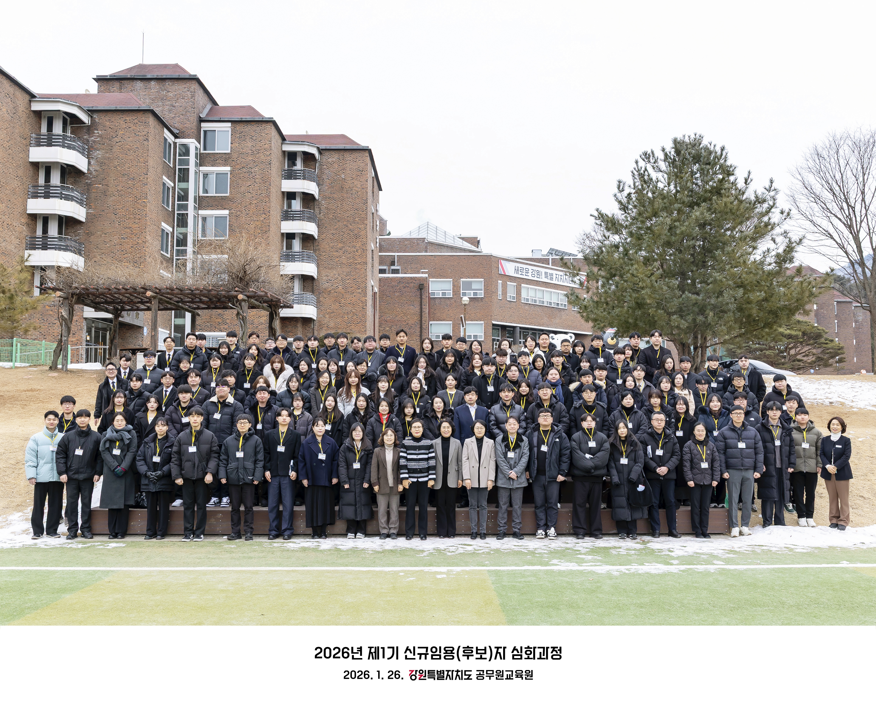 2026년 제1기 신규임용(후보)자 심화과정 교육생 입교식이 2026. 1. 26.(월) 10:00에 교육원에서 있었습니다. 2026. 1. 26.(월)부터 2. 13.(금)까지 3주간의 일정으로, 입교식 및 현충원 참배, 공직가치 내재화 교육을 시작으로 1주차 교육이 진행되었습니다. □ 교육 개요 1. 교육기간: 2026. 1. 26.(월) ~ 2. 13.(금) / 3주간 2. 교육장소: 강원특별자치도 공무원교육원 4층 제2강당 3. 도 및 시군 교육생: 120명(남 66,여 54) |