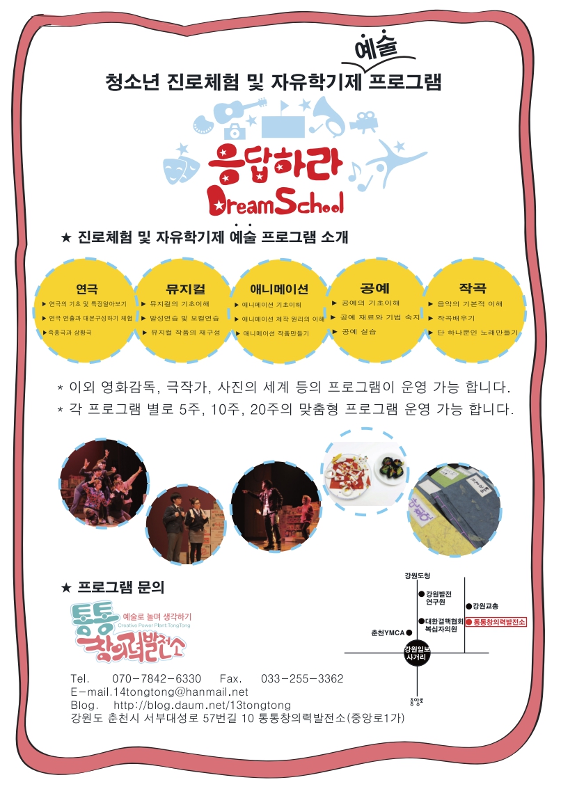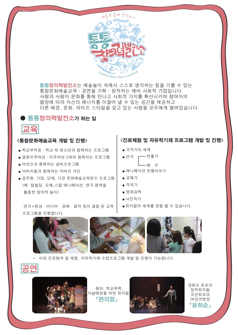 통통창의력발전소는 강원도가 지정한 지역형 예비사회적 기업입니다. 통통창의력발전소는 소외된 지역의 아동, 청소년, 노인, 다문화, 새터민등을 위한 문화예술교육 프로그램을 개발, 운영하는 단체로 다수의 교육 강사와 프로그램을 보유하고 있습니다. 기존의 강의 위주의 교육이 아닌 교육생이 직접 참여하고 수행하는 프로그램으로 21세기 창의 인재 교육의 선두적 역할을 하고 있습니다. 교육예시) 문화예술로 경험하는 팀빌딩 또는 문화예술놀이를 활용한 창의 인재 교육 - 내손의 작은 미디어 핸드폰을 활용한 (팀빌딩)미디어 교육 - 소리와 소리를 모아! : 아카펠라를 활용한 팀빌딩 교육 - 연극을 활용한 공감과 소통의 팀빌딩 교육 - 민화속 팝아트 등 다양한 교육프로그램과 강사진을 구성하고 있습니다. 기회가 된다면 강원도 인재 개발에 기여할 수 있기를 바랍니다. 아래의 연락처로 문의 하여 주시기 바랍니다. 통통창의력발전소 대표 김정훈 010-9000-3972 사무실 070-4223-3972 * 단체소개 및 프로그램에 대한 자세한 내용은 첨부파일을 참조하시기 바랍니다. |